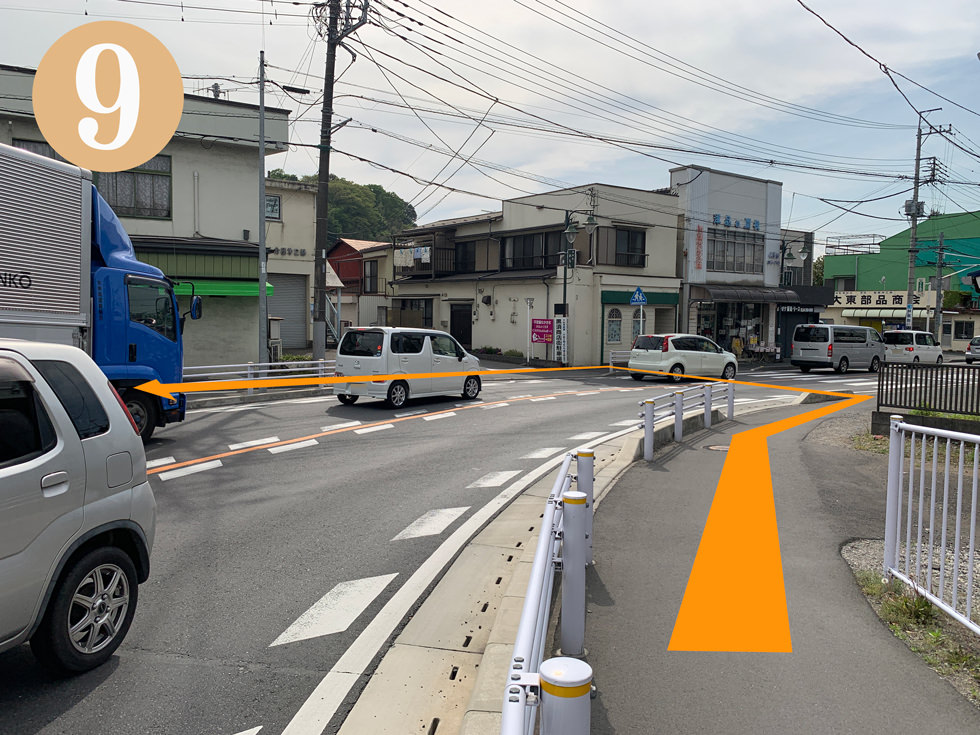 緩やかなカーブの先の横断歩道を反対側に渡り少し戻ります
